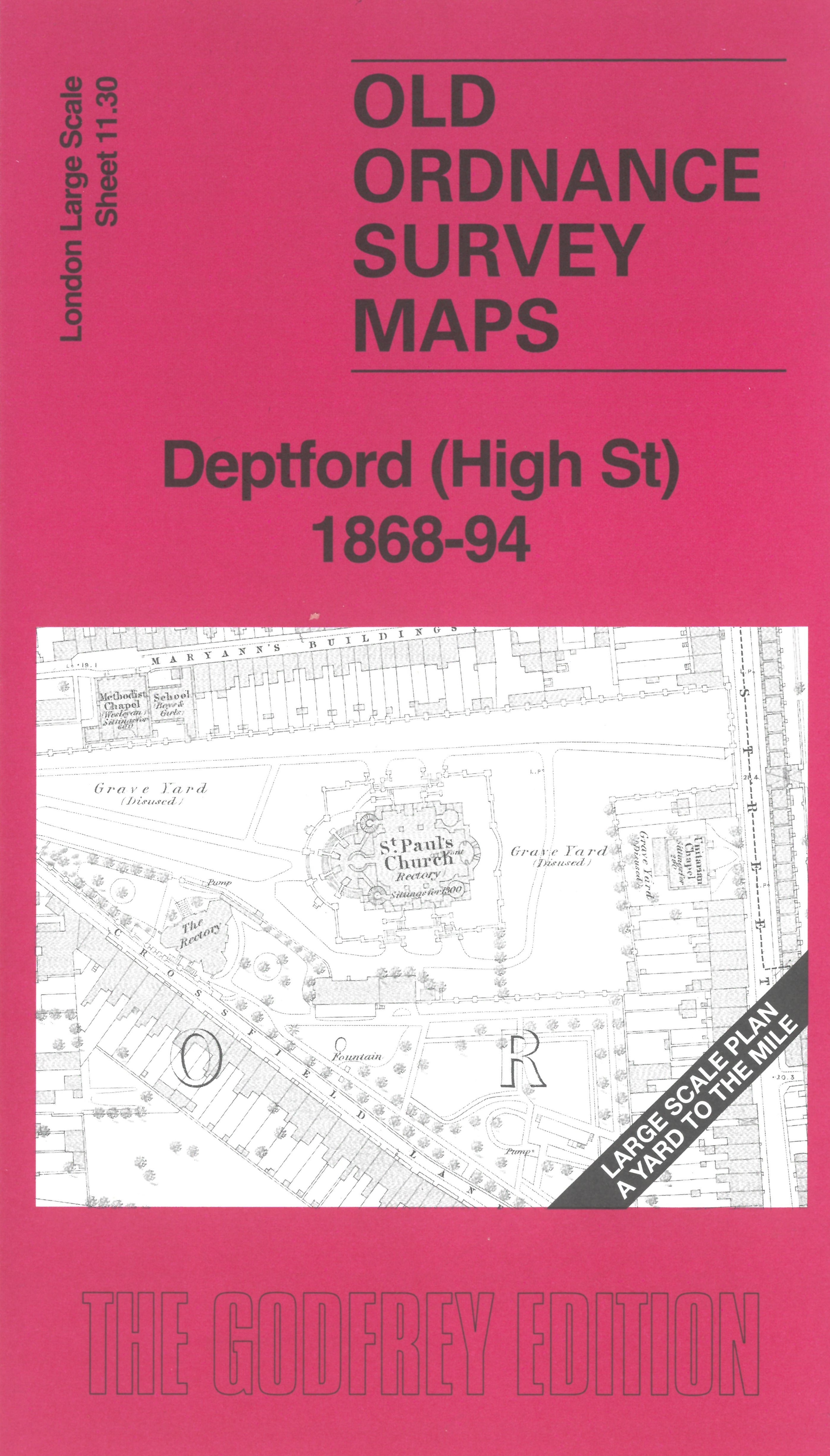 This very detailed map covers the centre of Deptford. Features include railway with Deptford station, St Paul's church, Trinity Almshouses, Addey's Charity, RC Chapel, Congregational Chapel, High Street with all buildings clearly shown, schools, etc.